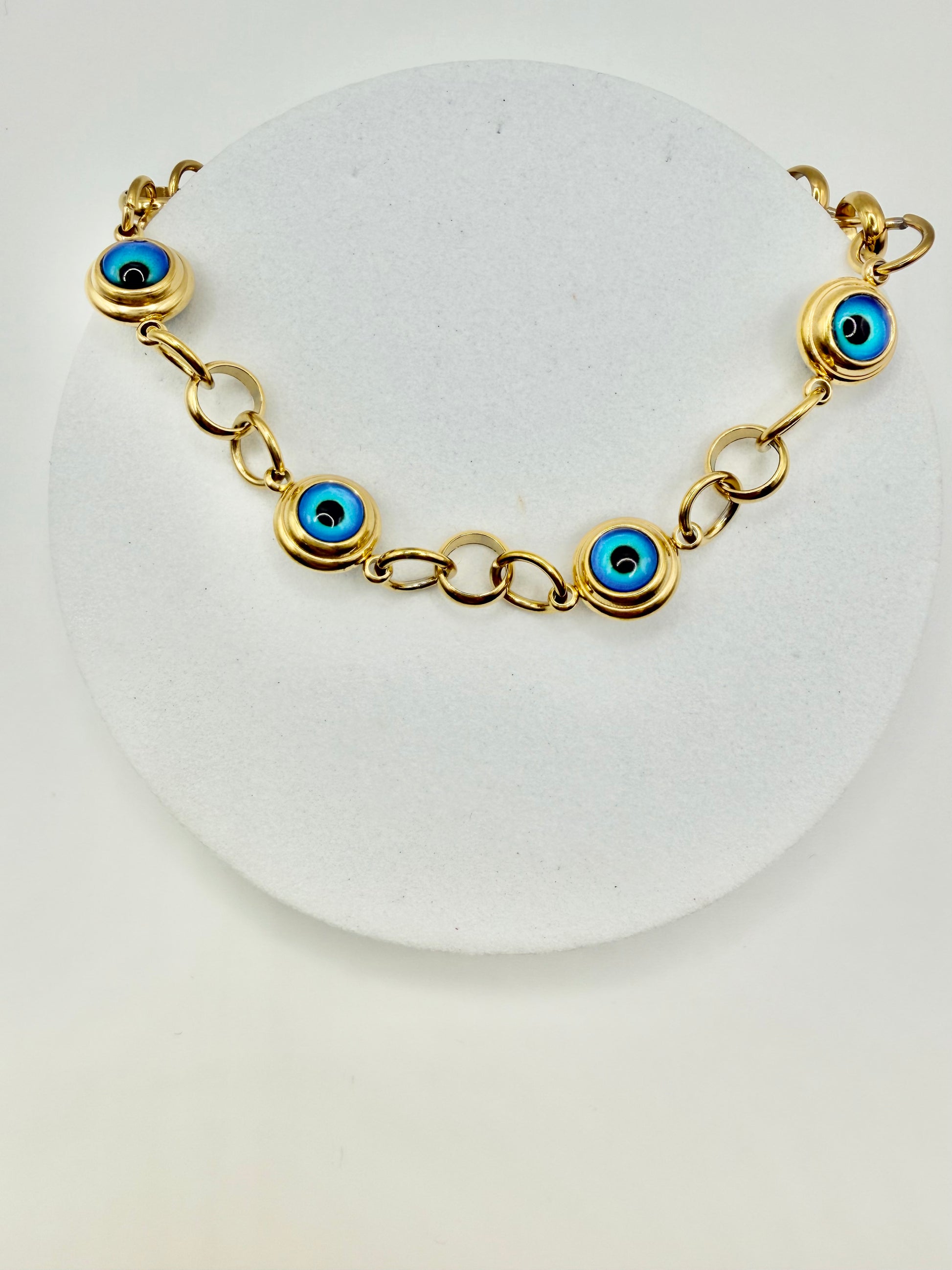 Crafted with intentional symbolism, this Evil Eye bracelet serves as a meaningful talisman designed to ward off negative energy and provide spiritual safeguarding. A timeless accessory that blends protective tradition with contemporary style, it makes a thoughtful addition to any jewellery collection for those seeking both aesthetic appeal and symbolic meaning.