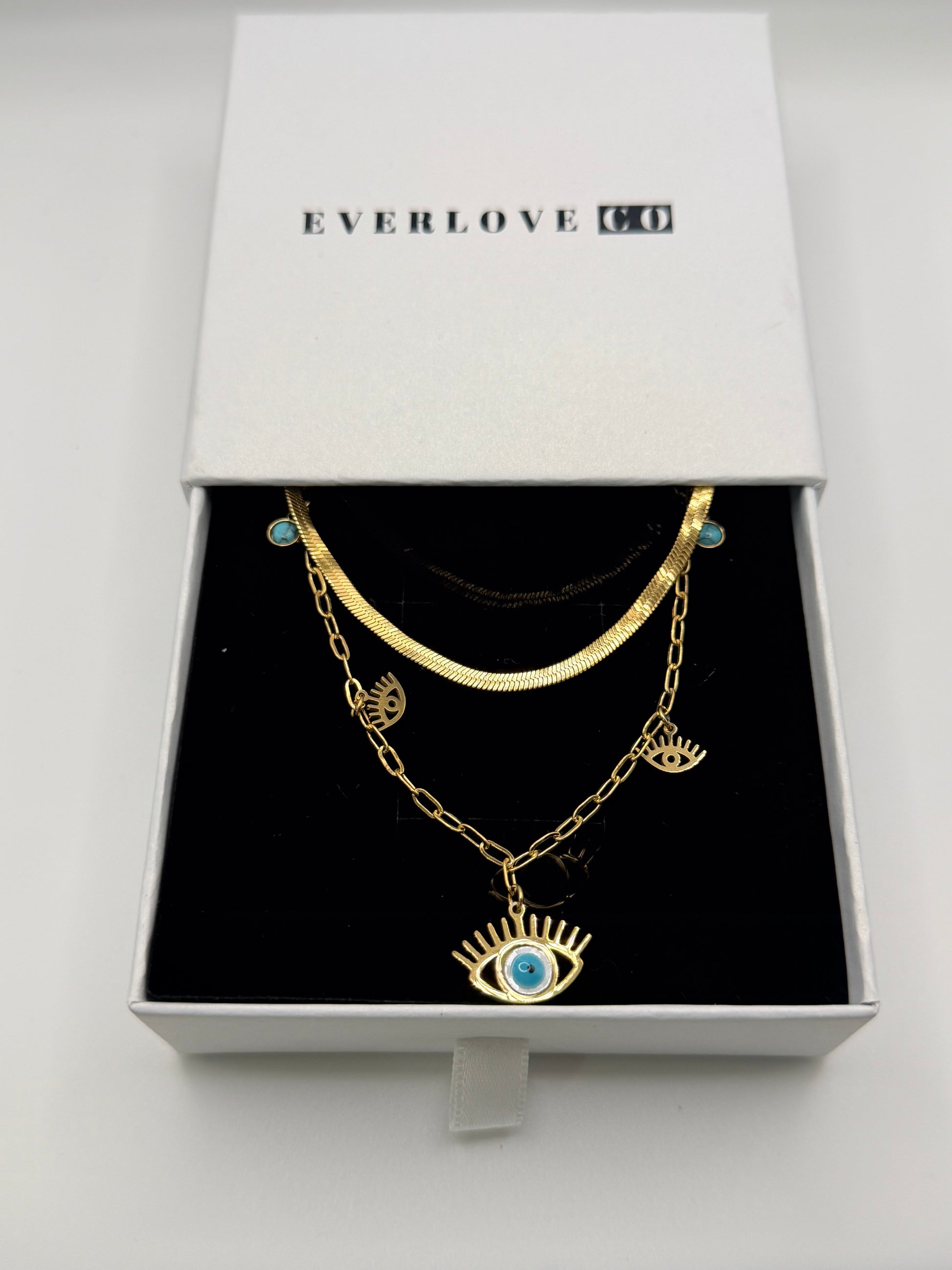 This striking two-layer Evil Eye necklace combines traditional symbolism with contemporary design. The layered construction creates visual depth and dimension, elevating the piece beyond standard interpretations. Crafted to make a confident statement, it merges timeless protective symbolism with modern aesthetic sensibilities, ensuring you stand out with understated sophistication.